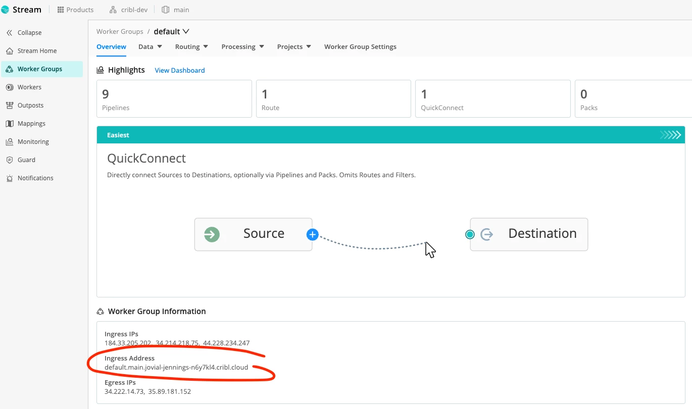 Start by connecting the Source to a Destination using either QuickConnect for a faster guided setup or Pipelines if you want more control over routing and processing.