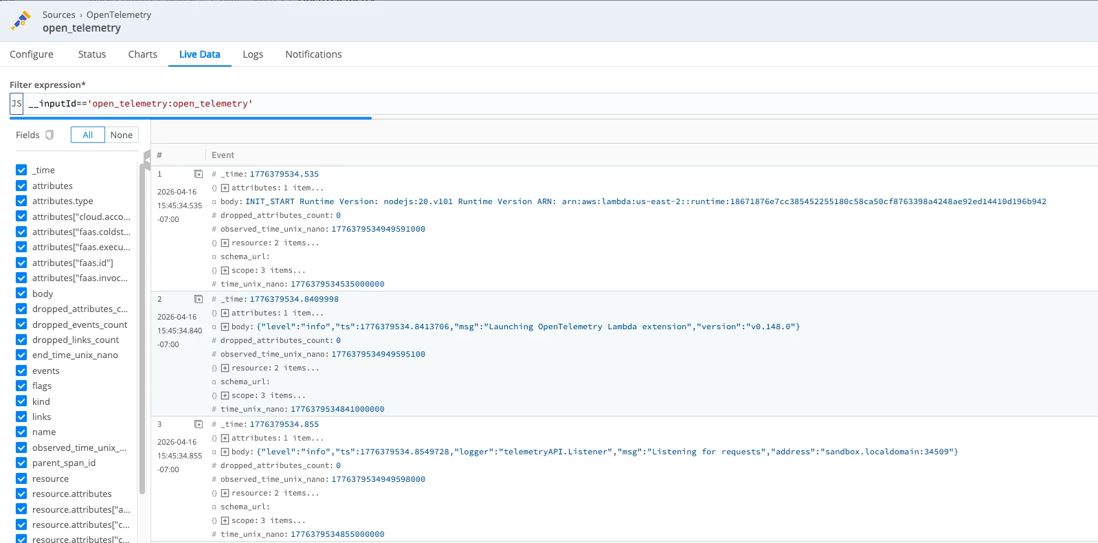In Live Data, you should see Lambda telemetry arriving as OpenTelemetry events. Depending on which fields you’ve selected and whether the event objects are expanded, you may see: