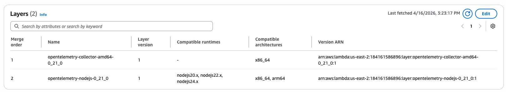 Attach both layers to your Lambda function via the console or CLI. If you need a refresher on how AWS layers work, see the Lambda layers documentation and how to add layers to a function.