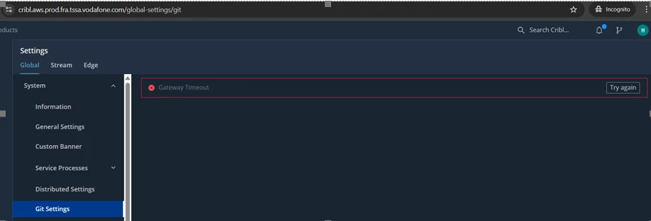 Am experiencing issue on cribl leader that no commits to be raised after any change I do. I wan not using any remote github and when I tried to change the settings in cribl to a current github repo, the git setting page gives me a gateway error and does not load at all