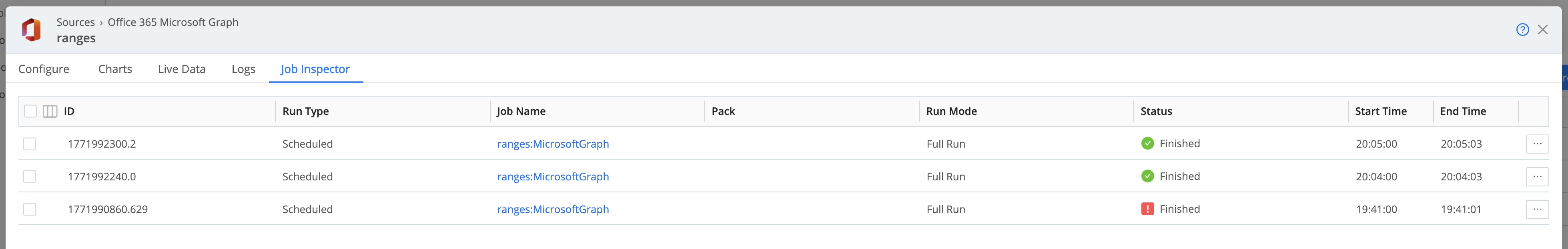 If the job fails, the status will appear with a red exclamation icon.